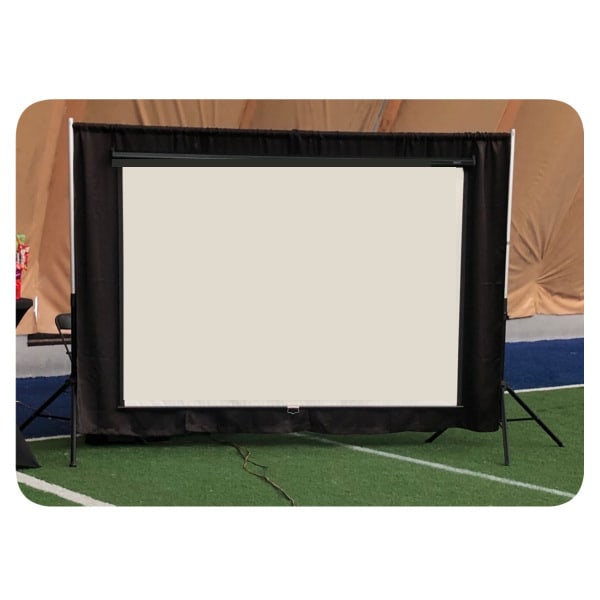 This 8 - foot projection screen is mounted to a black backdrop frame and can be install up to 10-foot high. This combination looks great paired with our indoor stage.
